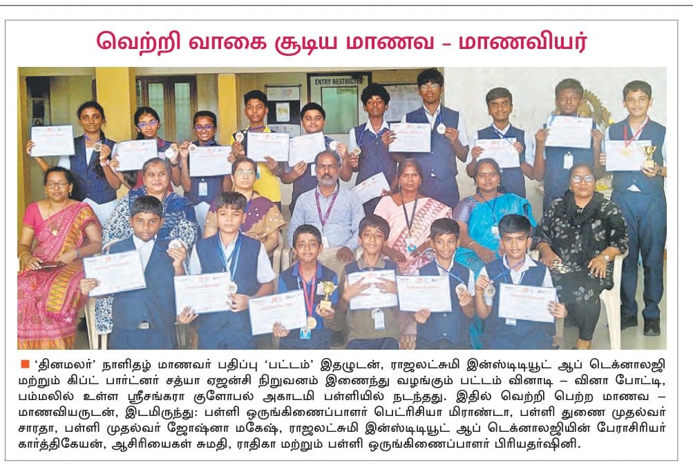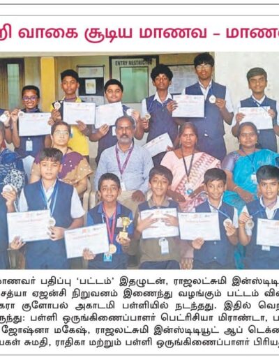 We are proud that our learners Srivatsan and Sachin Dharan of Grade-10 secured 1st place in the Inter-School compeittion “Unlock Science” held at Sri Sankara Matric. Hr.School in Ekambaram Street. Hearty congrats to the winners and sincere appreciation to the dedicated teachers behind this achievement !